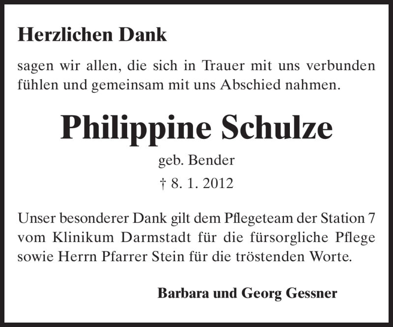 Hier finden Sie alle Traueranzeigen aus der Zeitung, die bisher für Philippine Schulze erschienen sind. Weitere Traueranzeigen, die in der Zeitung erscheinen, werden hier ebenfalls aufgelistet