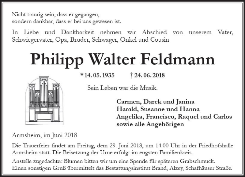 Hier finden Sie alle Traueranzeigen aus der Zeitung, die bisher für Philipp Walter Feldmann erschienen sind. Weitere Traueranzeigen, die in der Zeitung erscheinen, werden hier ebenfalls aufgelistet