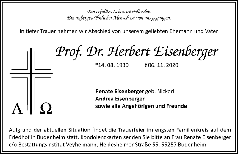 Hier finden Sie alle Traueranzeigen aus der Zeitung, die bisher für Prof. Dr. Herbert Eisenberger erschienen sind. Weitere Traueranzeigen, die in der Zeitung erscheinen, werden hier ebenfalls aufgelistet