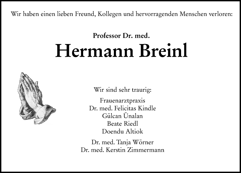 Hier finden Sie alle Traueranzeigen aus der Zeitung, die bisher für Professor Dr. med. Hermann Breinl erschienen sind. Weitere Traueranzeigen, die in der Zeitung erscheinen, werden hier ebenfalls aufgelistet