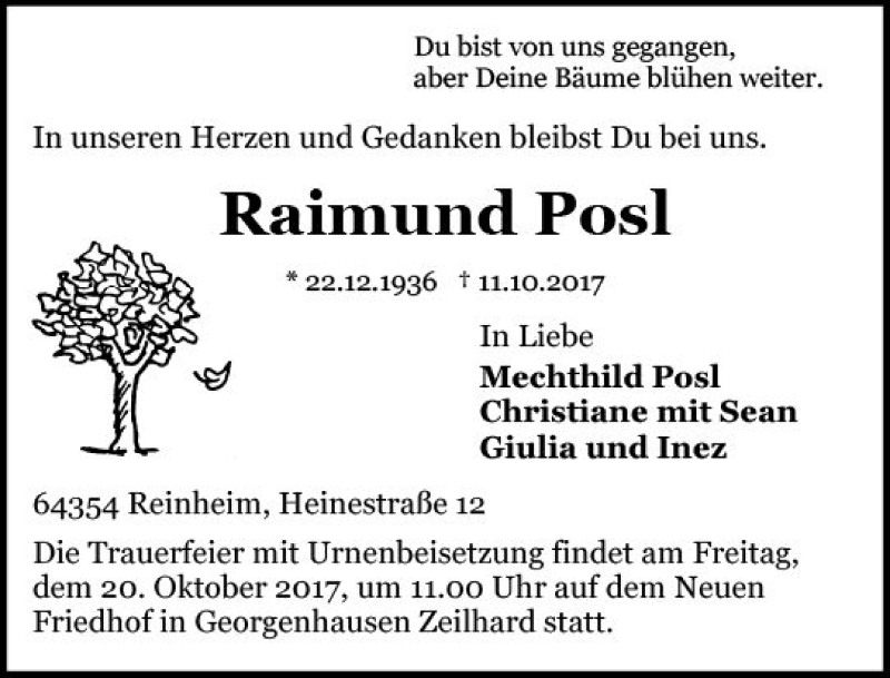 Hier finden Sie alle Traueranzeigen aus der Zeitung, die bisher für Raimund Posl erschienen sind. Weitere Traueranzeigen, die in der Zeitung erscheinen, werden hier ebenfalls aufgelistet