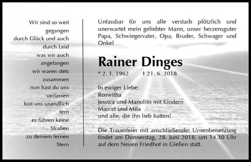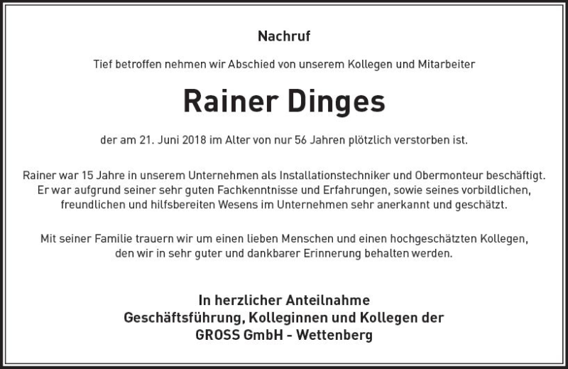 Hier finden Sie alle Traueranzeigen aus der Zeitung, die bisher für Rainer Dinges erschienen sind. Weitere Traueranzeigen, die in der Zeitung erscheinen, werden hier ebenfalls aufgelistet