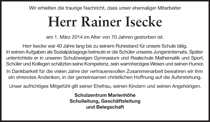 Hier finden Sie alle Traueranzeigen aus der Zeitung, die bisher für Rainer Isecke erschienen sind. Weitere Traueranzeigen, die in der Zeitung erscheinen, werden hier ebenfalls aufgelistet