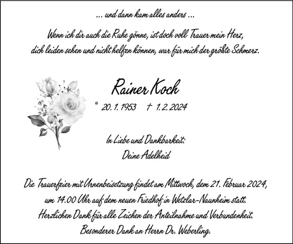 Hier finden Sie alle Traueranzeigen aus der Zeitung, die bisher für Rainer Koch erschienen sind. Weitere Traueranzeigen, die in der Zeitung erscheinen, werden hier ebenfalls aufgelistet