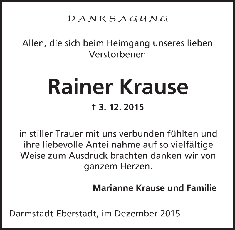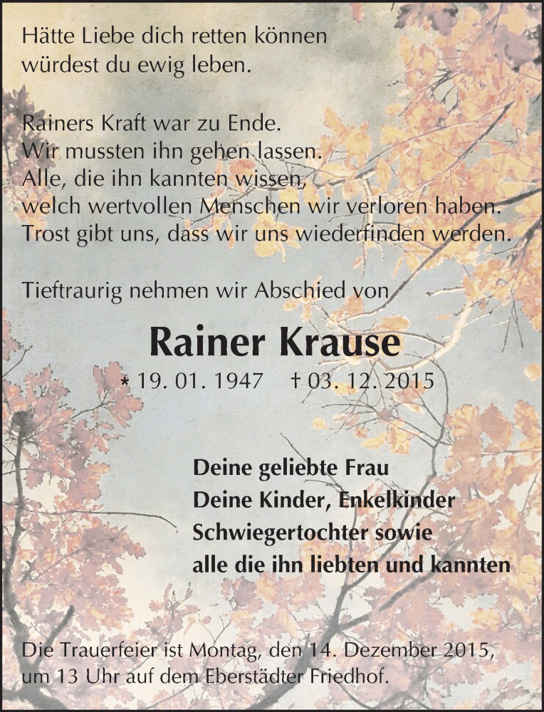 Hier finden Sie alle Traueranzeigen aus der Zeitung, die bisher für Rainer Krause erschienen sind. Weitere Traueranzeigen, die in der Zeitung erscheinen, werden hier ebenfalls aufgelistet