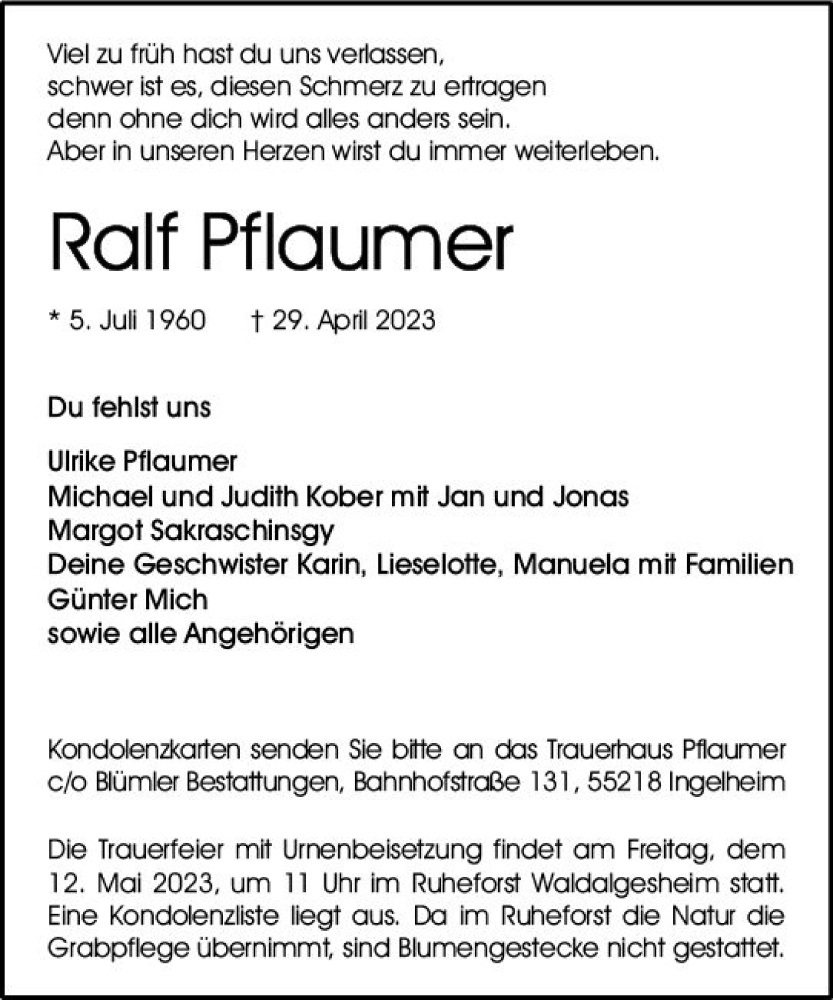 Hier finden Sie alle Traueranzeigen aus der Zeitung, die bisher für Ralf Pflaumer erschienen sind. Weitere Traueranzeigen, die in der Zeitung erscheinen, werden hier ebenfalls aufgelistet