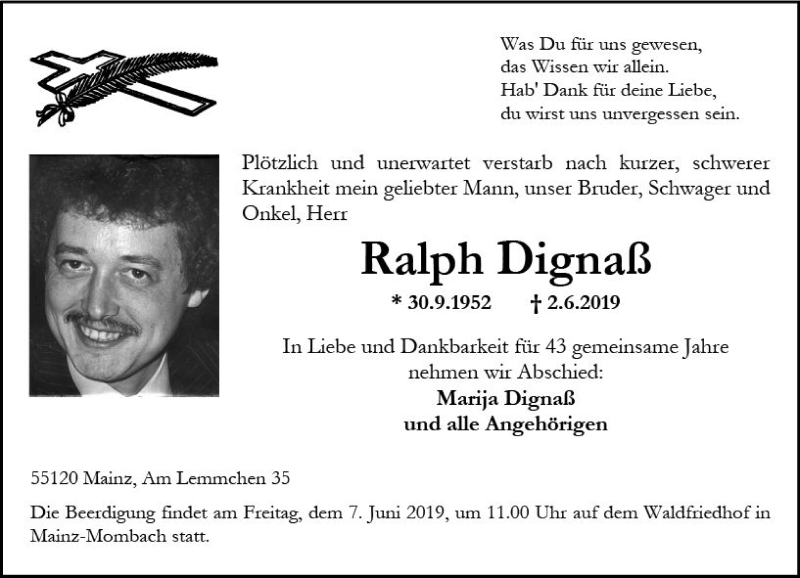 Hier finden Sie alle Traueranzeigen aus der Zeitung, die bisher für Ralph Dignaß erschienen sind. Weitere Traueranzeigen, die in der Zeitung erscheinen, werden hier ebenfalls aufgelistet