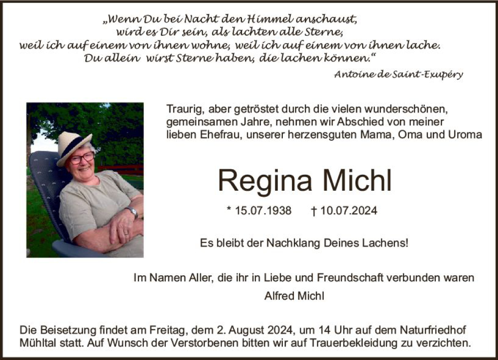 Hier finden Sie alle Traueranzeigen aus der Zeitung, die bisher für Regina Michl erschienen sind. Weitere Traueranzeigen, die in der Zeitung erscheinen, werden hier ebenfalls aufgelistet