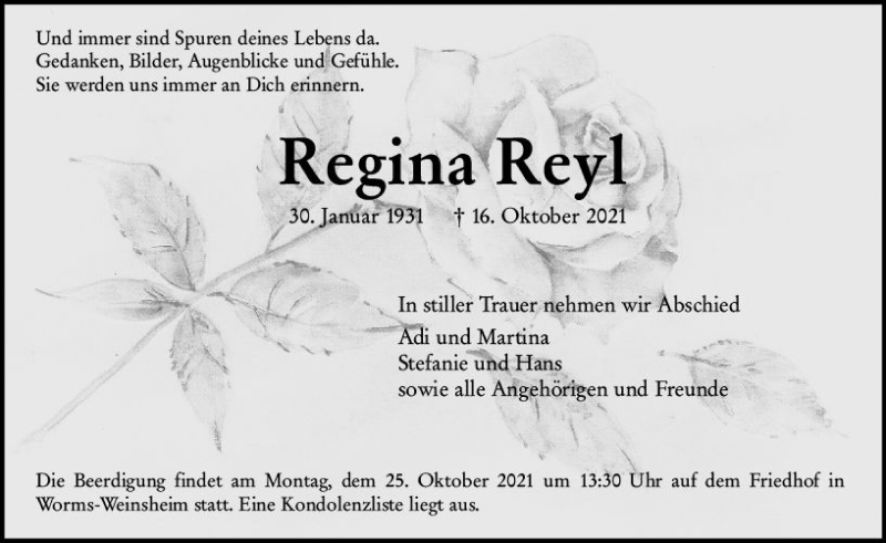 Hier finden Sie alle Traueranzeigen aus der Zeitung, die bisher für Regina Reyl erschienen sind. Weitere Traueranzeigen, die in der Zeitung erscheinen, werden hier ebenfalls aufgelistet