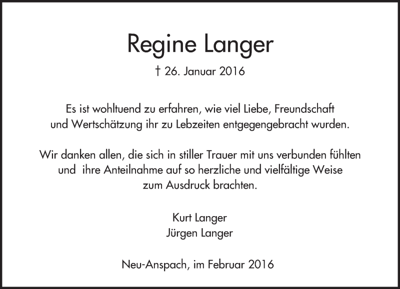 Hier finden Sie alle Traueranzeigen aus der Zeitung, die bisher für Regine Langer erschienen sind. Weitere Traueranzeigen, die in der Zeitung erscheinen, werden hier ebenfalls aufgelistet