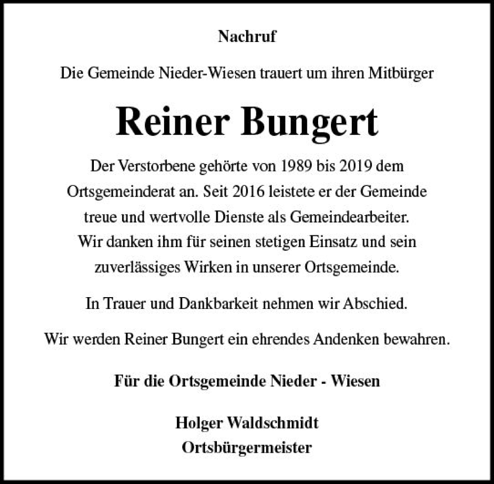 Hier finden Sie alle Traueranzeigen aus der Zeitung, die bisher für Reiner Bungert erschienen sind. Weitere Traueranzeigen, die in der Zeitung erscheinen, werden hier ebenfalls aufgelistet