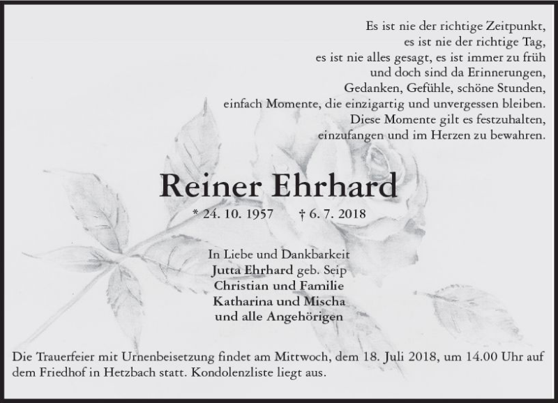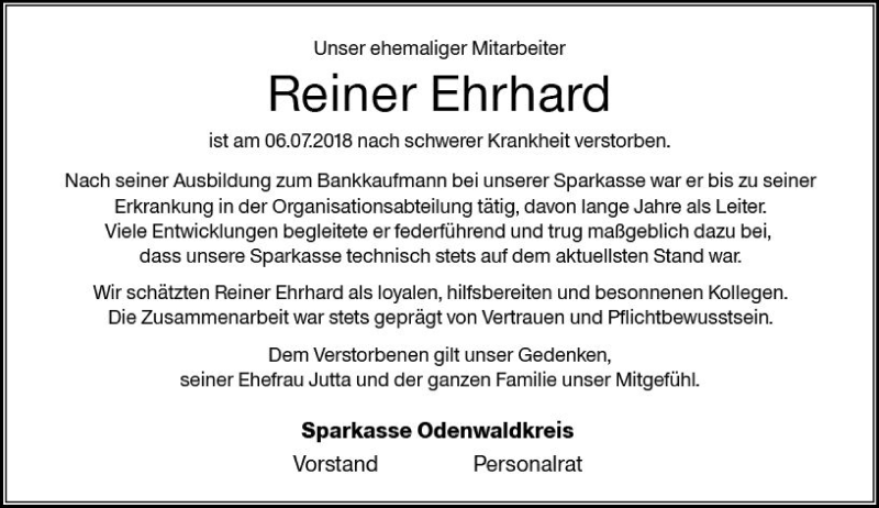 Hier finden Sie alle Traueranzeigen aus der Zeitung, die bisher für Reiner Ehrhard erschienen sind. Weitere Traueranzeigen, die in der Zeitung erscheinen, werden hier ebenfalls aufgelistet