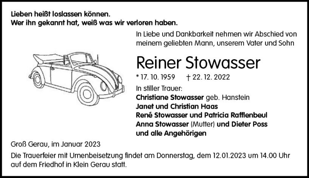 Hier finden Sie alle Traueranzeigen aus der Zeitung, die bisher für Reiner Stowasser erschienen sind. Weitere Traueranzeigen, die in der Zeitung erscheinen, werden hier ebenfalls aufgelistet