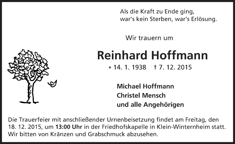 Hier finden Sie alle Traueranzeigen aus der Zeitung, die bisher für Reinhard Hoffmann erschienen sind. Weitere Traueranzeigen, die in der Zeitung erscheinen, werden hier ebenfalls aufgelistet