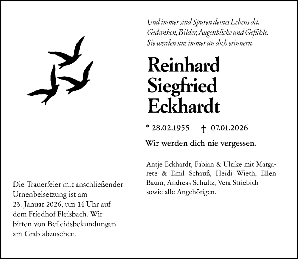 Hier finden Sie alle Traueranzeigen aus der Zeitung, die bisher für Reinhard Siegfried Eckhardt erschienen sind. Weitere Traueranzeigen, die in der Zeitung erscheinen, werden hier ebenfalls aufgelistet