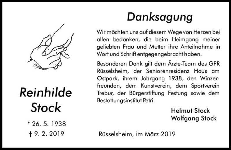 Hier finden Sie alle Traueranzeigen aus der Zeitung, die bisher für Reinhilde Stock erschienen sind. Weitere Traueranzeigen, die in der Zeitung erscheinen, werden hier ebenfalls aufgelistet