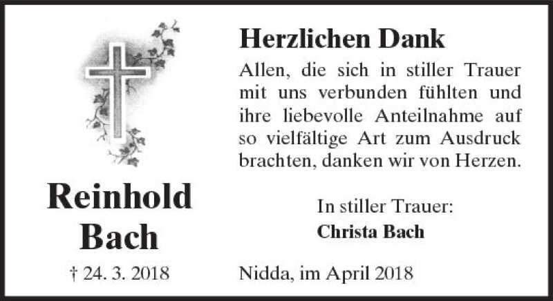 Hier finden Sie alle Traueranzeigen aus der Zeitung, die bisher für Reinhold Bach erschienen sind. Weitere Traueranzeigen, die in der Zeitung erscheinen, werden hier ebenfalls aufgelistet