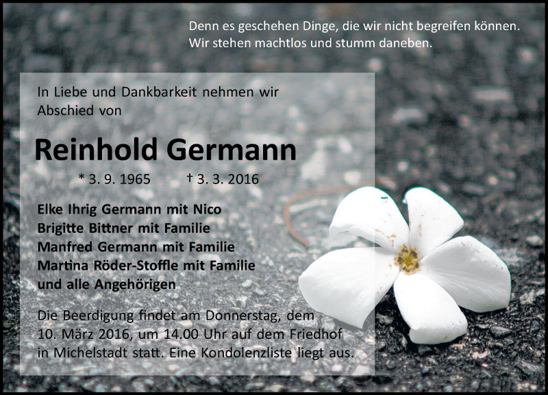 Hier finden Sie alle Traueranzeigen aus der Zeitung, die bisher für Reinhold Germann erschienen sind. Weitere Traueranzeigen, die in der Zeitung erscheinen, werden hier ebenfalls aufgelistet