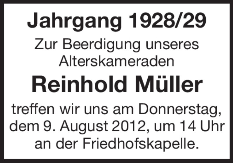 Hier finden Sie alle Traueranzeigen aus der Zeitung, die bisher für Reinhold Müller erschienen sind. Weitere Traueranzeigen, die in der Zeitung erscheinen, werden hier ebenfalls aufgelistet