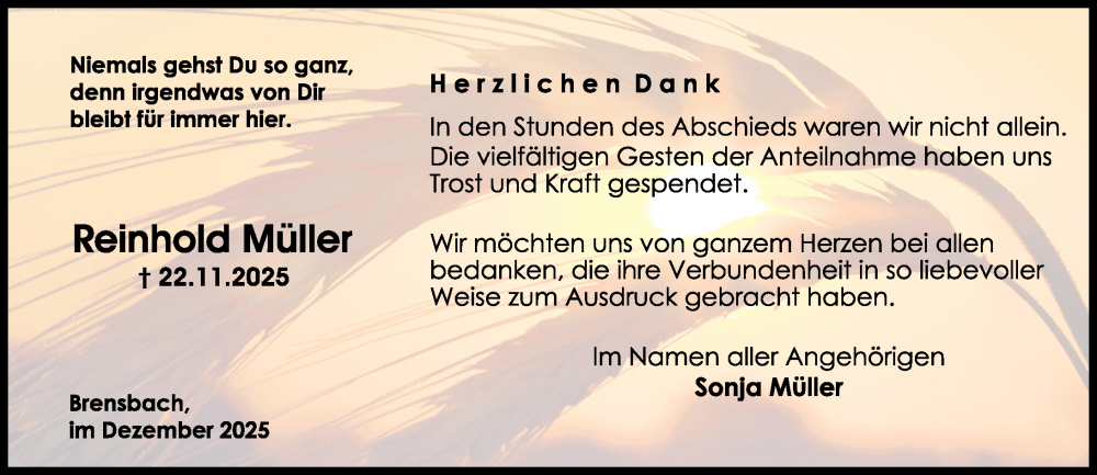 Hier finden Sie alle Traueranzeigen aus der Zeitung, die bisher für Reinhold Müller erschienen sind. Weitere Traueranzeigen, die in der Zeitung erscheinen, werden hier ebenfalls aufgelistet