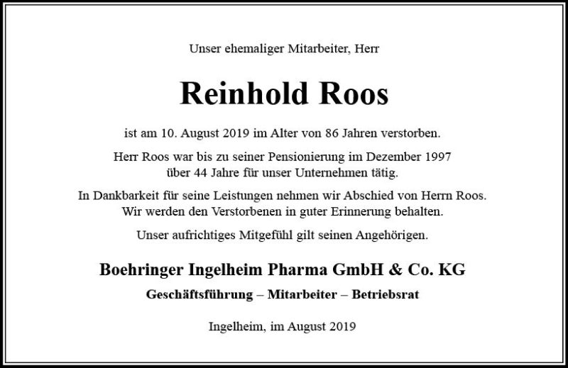 Hier finden Sie alle Traueranzeigen aus der Zeitung, die bisher für Reinhold Roos erschienen sind. Weitere Traueranzeigen, die in der Zeitung erscheinen, werden hier ebenfalls aufgelistet