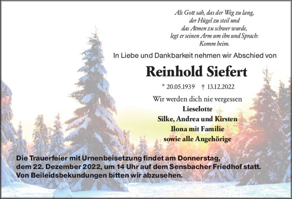 Hier finden Sie alle Traueranzeigen aus der Zeitung, die bisher für Reinhold Siefert erschienen sind. Weitere Traueranzeigen, die in der Zeitung erscheinen, werden hier ebenfalls aufgelistet