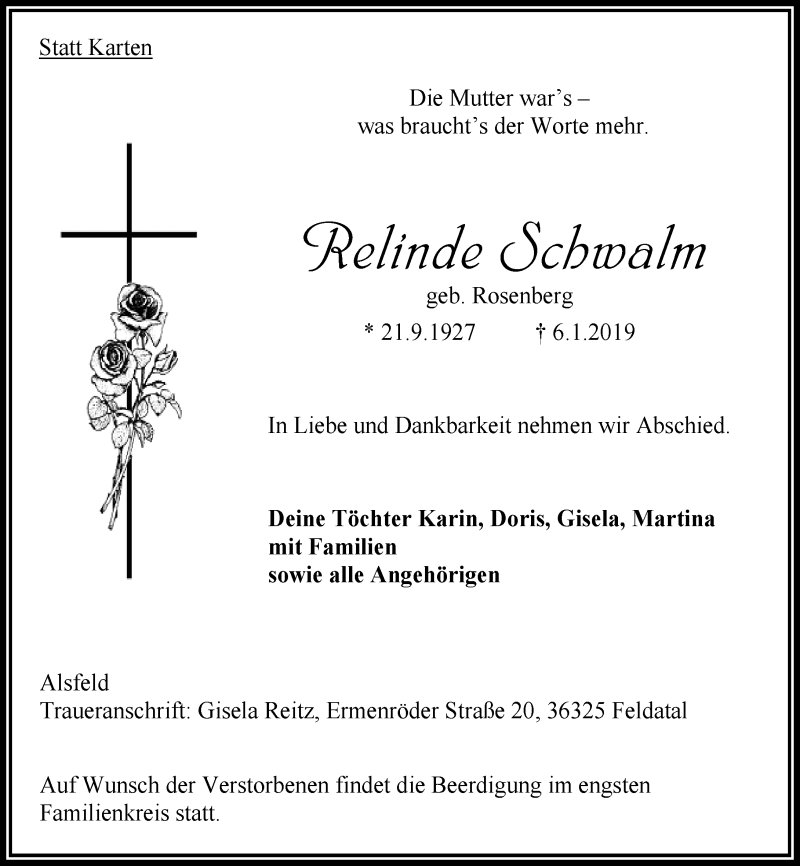 Hier finden Sie alle Traueranzeigen aus der Zeitung, die bisher für Relinde Schwalm erschienen sind. Weitere Traueranzeigen, die in der Zeitung erscheinen, werden hier ebenfalls aufgelistet