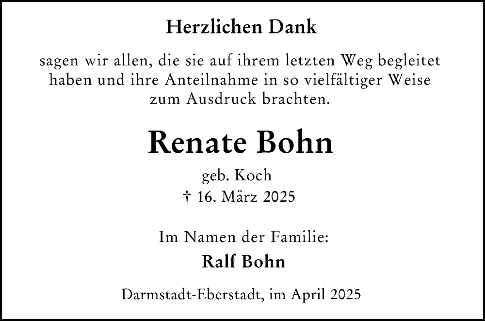 Hier finden Sie alle Traueranzeigen aus der Zeitung, die bisher für Renate Bohn erschienen sind. Weitere Traueranzeigen, die in der Zeitung erscheinen, werden hier ebenfalls aufgelistet