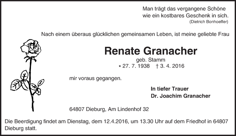 Hier finden Sie alle Traueranzeigen aus der Zeitung, die bisher für Renate Granacher erschienen sind. Weitere Traueranzeigen, die in der Zeitung erscheinen, werden hier ebenfalls aufgelistet