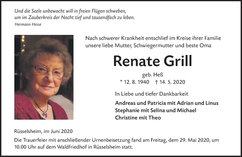 Hier finden Sie alle Traueranzeigen aus der Zeitung, die bisher für Renate Grill erschienen sind. Weitere Traueranzeigen, die in der Zeitung erscheinen, werden hier ebenfalls aufgelistet