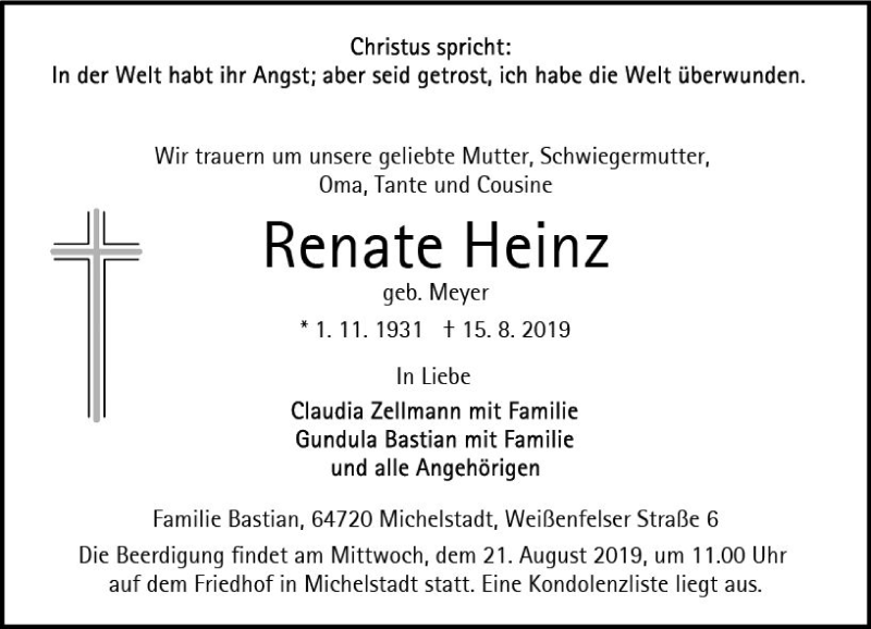 Hier finden Sie alle Traueranzeigen aus der Zeitung, die bisher für Renate Heinz erschienen sind. Weitere Traueranzeigen, die in der Zeitung erscheinen, werden hier ebenfalls aufgelistet