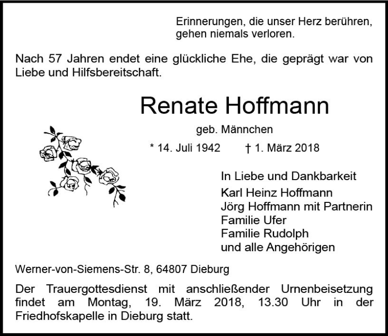 Hier finden Sie alle Traueranzeigen aus der Zeitung, die bisher für Renate Hoffmann erschienen sind. Weitere Traueranzeigen, die in der Zeitung erscheinen, werden hier ebenfalls aufgelistet