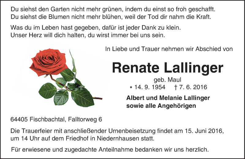 Hier finden Sie alle Traueranzeigen aus der Zeitung, die bisher für Renate Lallinger erschienen sind. Weitere Traueranzeigen, die in der Zeitung erscheinen, werden hier ebenfalls aufgelistet