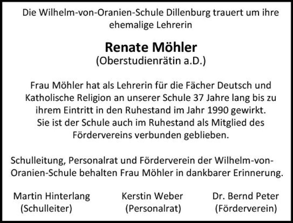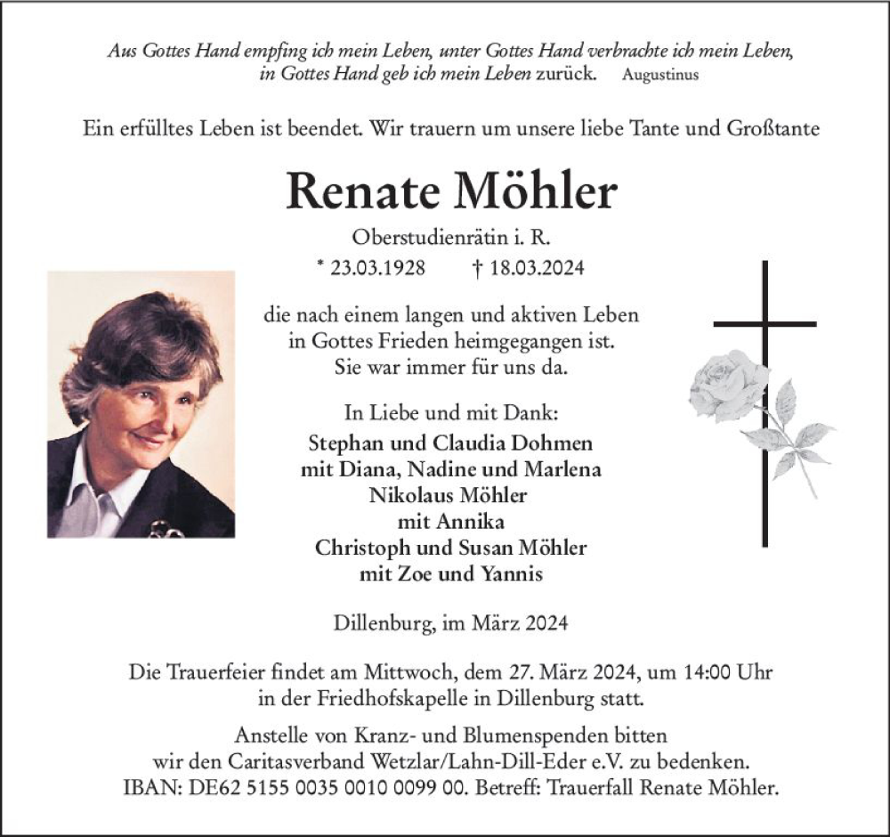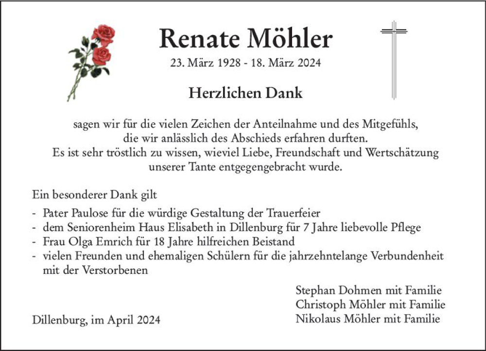 Hier finden Sie alle Traueranzeigen aus der Zeitung, die bisher für Renate Möhler erschienen sind. Weitere Traueranzeigen, die in der Zeitung erscheinen, werden hier ebenfalls aufgelistet