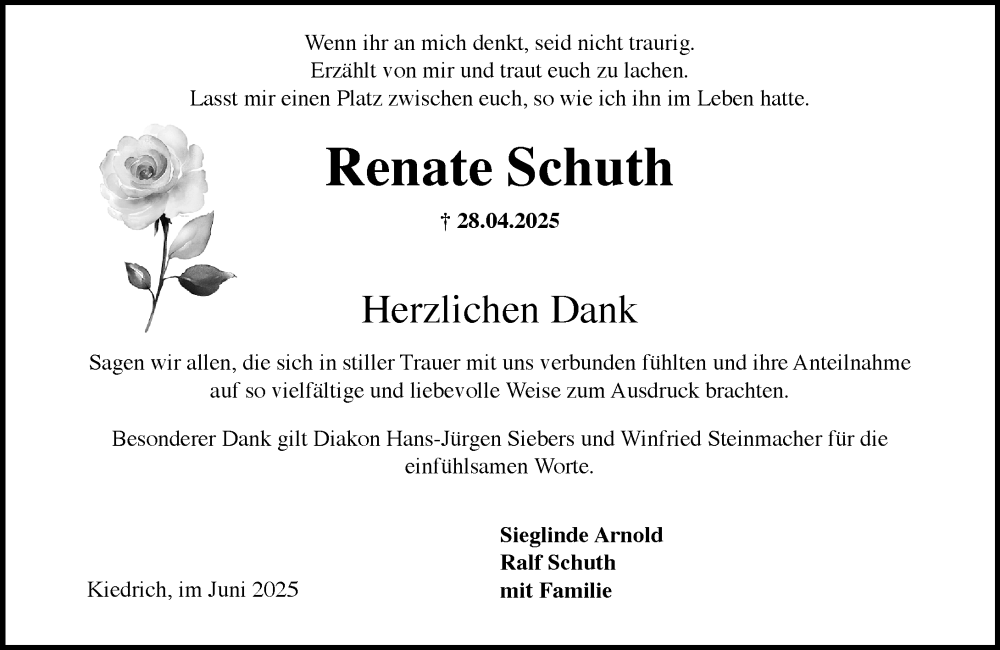 Hier finden Sie alle Traueranzeigen aus der Zeitung, die bisher für Renate Schuth erschienen sind. Weitere Traueranzeigen, die in der Zeitung erscheinen, werden hier ebenfalls aufgelistet