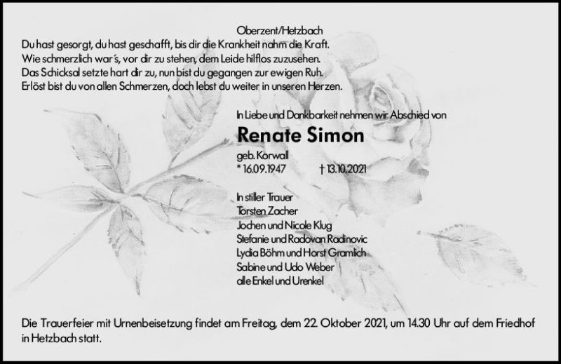 Hier finden Sie alle Traueranzeigen aus der Zeitung, die bisher für Renate Simon erschienen sind. Weitere Traueranzeigen, die in der Zeitung erscheinen, werden hier ebenfalls aufgelistet