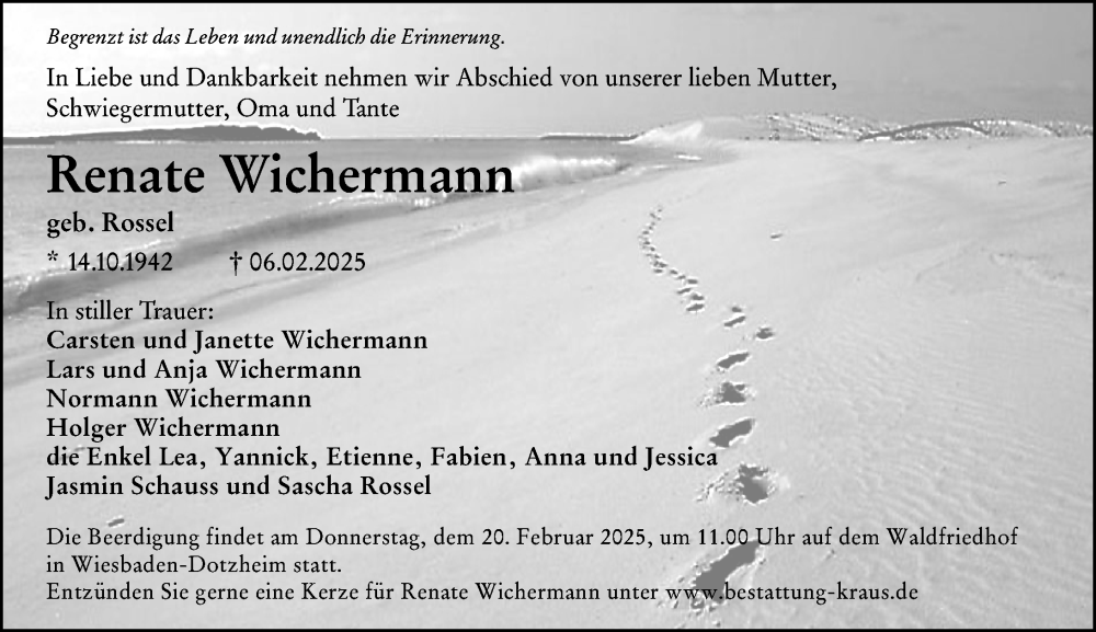 Hier finden Sie alle Traueranzeigen aus der Zeitung, die bisher für Renate Wichermann erschienen sind. Weitere Traueranzeigen, die in der Zeitung erscheinen, werden hier ebenfalls aufgelistet