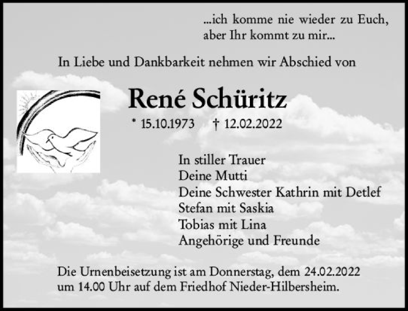 Hier finden Sie alle Traueranzeigen aus der Zeitung, die bisher für Rene Schüritz erschienen sind. Weitere Traueranzeigen, die in der Zeitung erscheinen, werden hier ebenfalls aufgelistet