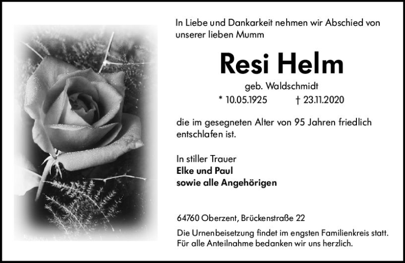 Hier finden Sie alle Traueranzeigen aus der Zeitung, die bisher für Resi Helm erschienen sind. Weitere Traueranzeigen, die in der Zeitung erscheinen, werden hier ebenfalls aufgelistet