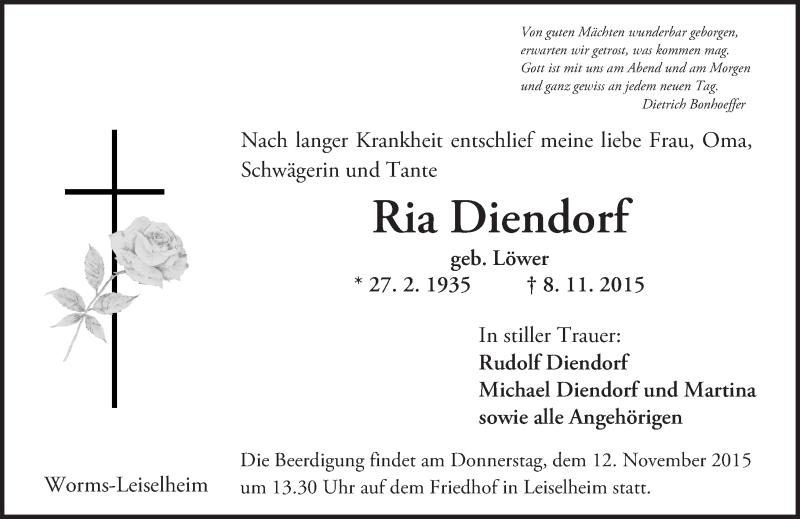 Hier finden Sie alle Traueranzeigen aus der Zeitung, die bisher für Ria Diendorf erschienen sind. Weitere Traueranzeigen, die in der Zeitung erscheinen, werden hier ebenfalls aufgelistet