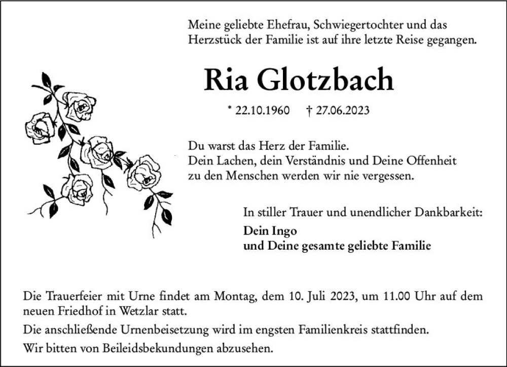 Hier finden Sie alle Traueranzeigen aus der Zeitung, die bisher für Ria Glotzbach erschienen sind. Weitere Traueranzeigen, die in der Zeitung erscheinen, werden hier ebenfalls aufgelistet