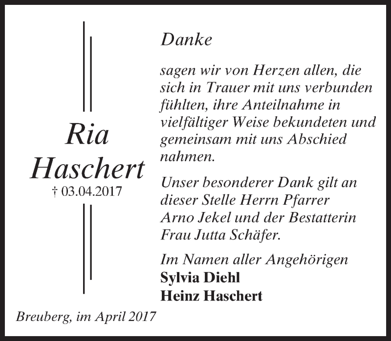 Hier finden Sie alle Traueranzeigen aus der Zeitung, die bisher für Ria Haschert erschienen sind. Weitere Traueranzeigen, die in der Zeitung erscheinen, werden hier ebenfalls aufgelistet