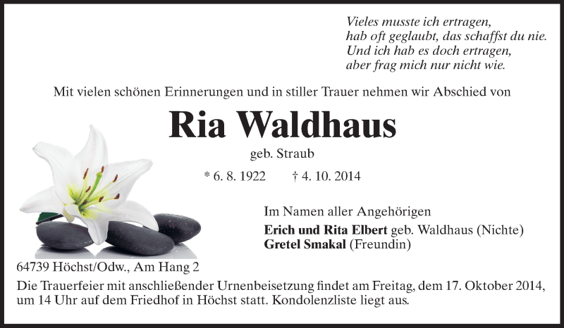 Hier finden Sie alle Traueranzeigen aus der Zeitung, die bisher für Ria Waldhaus erschienen sind. Weitere Traueranzeigen, die in der Zeitung erscheinen, werden hier ebenfalls aufgelistet