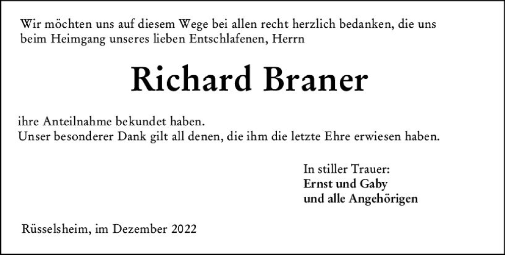 Hier finden Sie alle Traueranzeigen aus der Zeitung, die bisher für Richard Braner erschienen sind. Weitere Traueranzeigen, die in der Zeitung erscheinen, werden hier ebenfalls aufgelistet