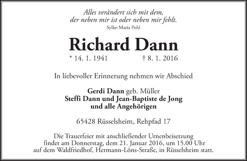 Hier finden Sie alle Traueranzeigen aus der Zeitung, die bisher für Richard Dann erschienen sind. Weitere Traueranzeigen, die in der Zeitung erscheinen, werden hier ebenfalls aufgelistet