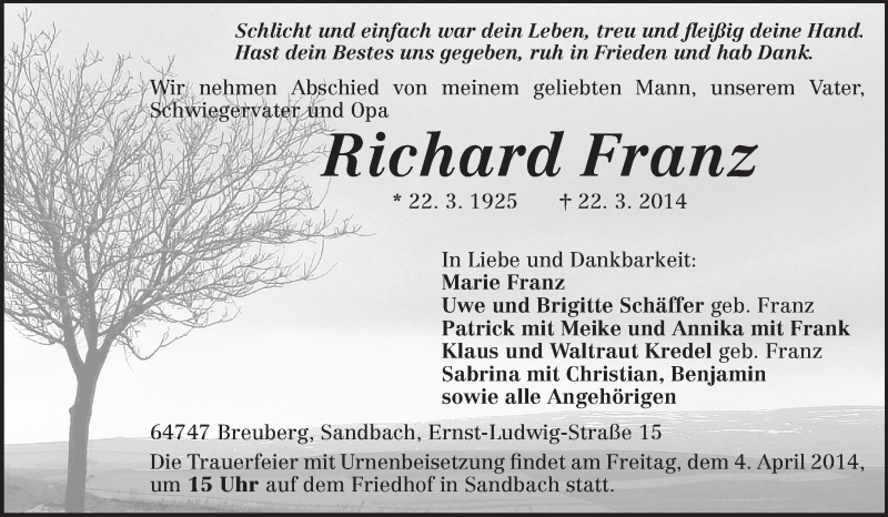 Hier finden Sie alle Traueranzeigen aus der Zeitung, die bisher für Richard Franz erschienen sind. Weitere Traueranzeigen, die in der Zeitung erscheinen, werden hier ebenfalls aufgelistet