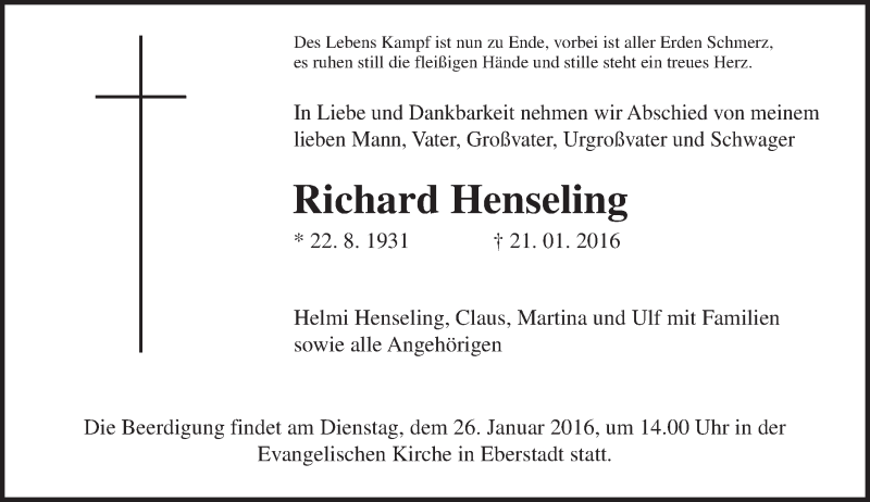 Hier finden Sie alle Traueranzeigen aus der Zeitung, die bisher für Richard Henseling erschienen sind. Weitere Traueranzeigen, die in der Zeitung erscheinen, werden hier ebenfalls aufgelistet