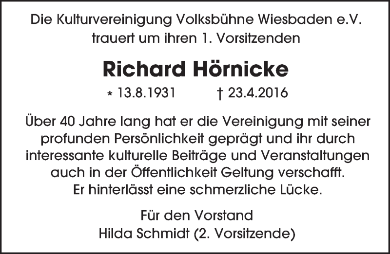 Hier finden Sie alle Traueranzeigen aus der Zeitung, die bisher für Richard Hörnicke erschienen sind. Weitere Traueranzeigen, die in der Zeitung erscheinen, werden hier ebenfalls aufgelistet