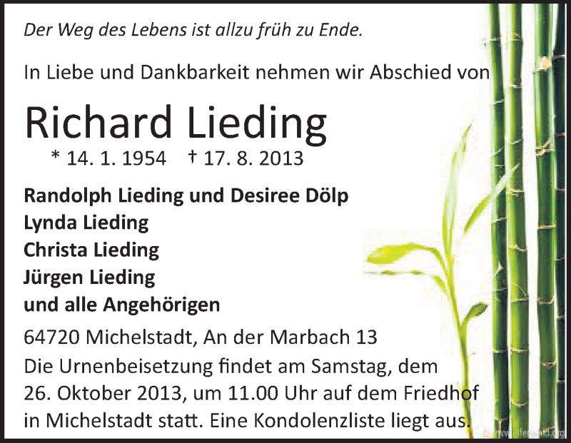Hier finden Sie alle Traueranzeigen aus der Zeitung, die bisher für Richard Lieding erschienen sind. Weitere Traueranzeigen, die in der Zeitung erscheinen, werden hier ebenfalls aufgelistet