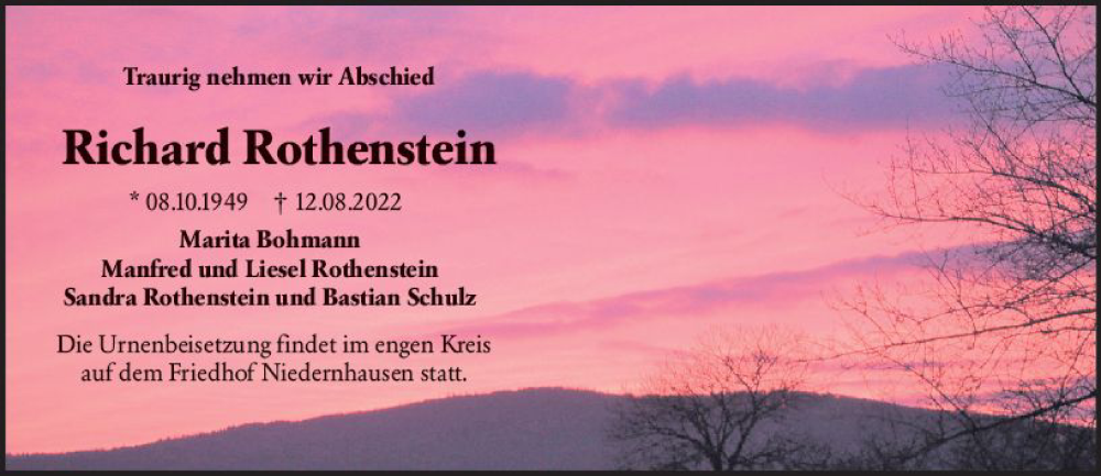 Hier finden Sie alle Traueranzeigen aus der Zeitung, die bisher für Richard Rothenstein erschienen sind. Weitere Traueranzeigen, die in der Zeitung erscheinen, werden hier ebenfalls aufgelistet
